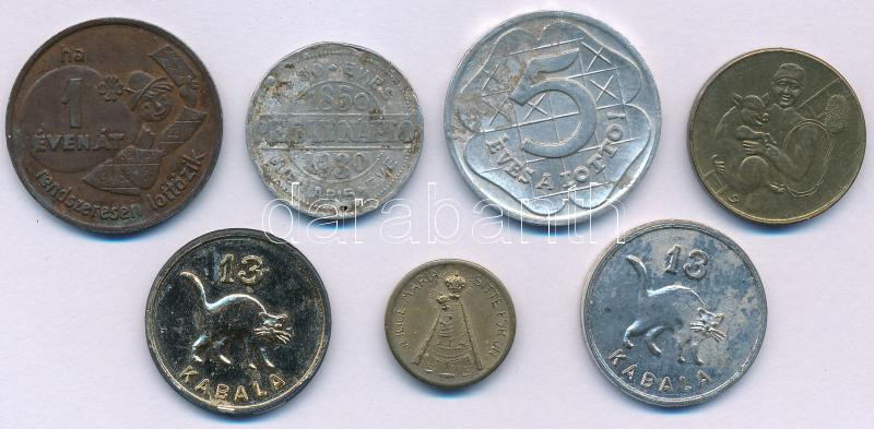 7db-os "szerencsepénz" zseton tétel, benne "Lottó", "BÚÉK", 1930. "80 éves a Pesti Napló", Ausztria DN "Heilige Maria bitte für uns / Glücksgroschen" bronz zseton T:AU-VF
