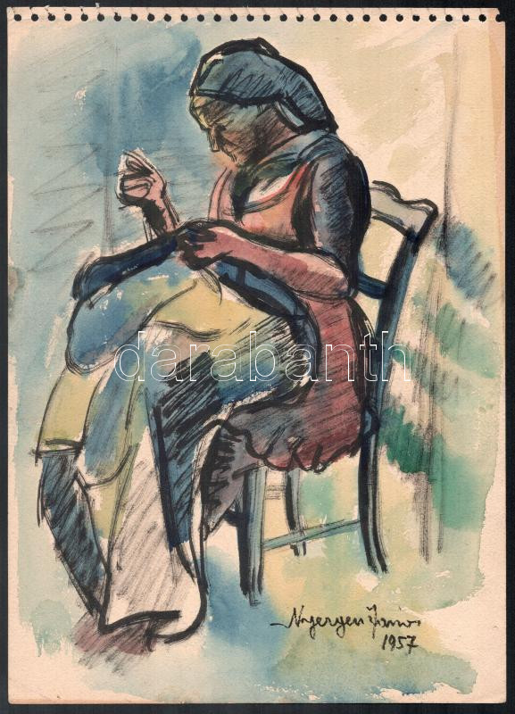 Leírás: Nyergesi János (1895-1982): Varró asszony, 1957. Akvarell, tus, papír, jelzett. 33,5x24 cm.