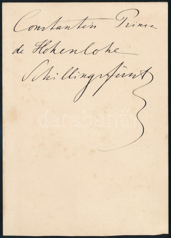 cca 1870 Konstantin zu Hohenlohe-Schillingsfürst (1828-1896) herceg, az osztrák császári udvar első főudvarmestere, lovassági tábornok; angol műteremben (Scarborough) készült kabinetfotó, a hátoldalon feliratozva, alja vágott, 15x10,5 cm // cca 1870 Prince Konstantin zu Hohenlohe-Schillingsfürst (1828-1896) k.u.k. First Obersthofmeister (chief of staff of the imperial and royal court), General of the Cavalry; cabinet card from an English studio in Scarborough, with description on the reverse, cut on the bottom, 15x10.5 cm