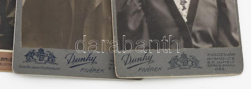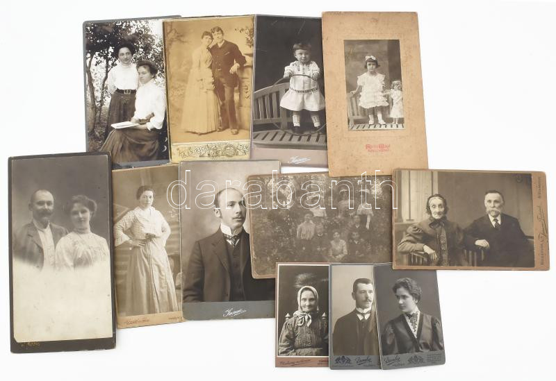 cca 1900-1920, 12 darab keményhátú fotó erdélyi műtermekből, közte Kolozsvár, Máramarossziget, Marosvásárhely, Temesvár, Brassó, Arad, Nagyvárad, zömmel egy- és kétszemélyes portrék, 1-1 kopással, sarokhibával, folttal, klf méretben 21x11 cm alatt
