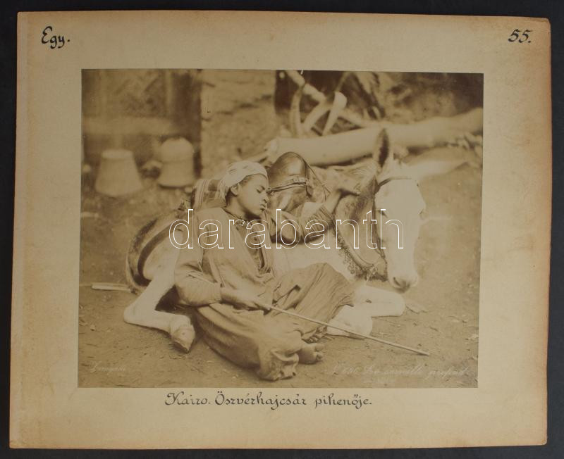 cca 1900 Félix Bonfils (1831-1885): Öszvérhajcsár pihenője / Kairó Shepeard szálloda, magyar utazó által feliratozott fotók kétoldalas karton 38x30 cm