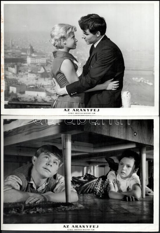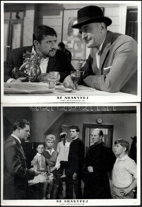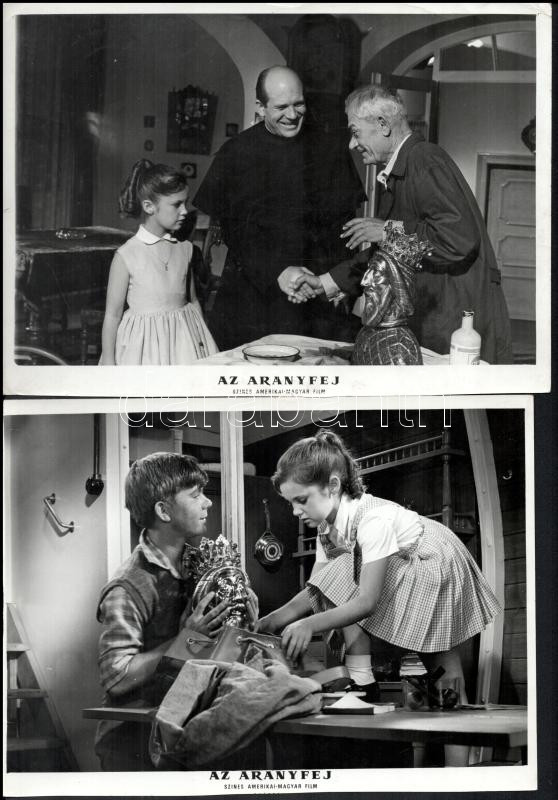 cca 1989 előtt készült, "Az aranyfej" című magyar film jelenetei és szereplői, 13 db vintage produkciós filmfotó (vitrinfotó, lobbyfotó) ezüst zselatinos fotópapíron, a használatból eredő (esetleges) kisebb hibákkal, 18x24 cm