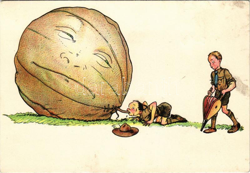 Leírás: Cserkész művészlap. Magyar Cserkészszövetség kiadása. Klösz Gy. és Fia / Hungarian boy scout art postcard. unsigned Márton L. (lyuk / pinhole)