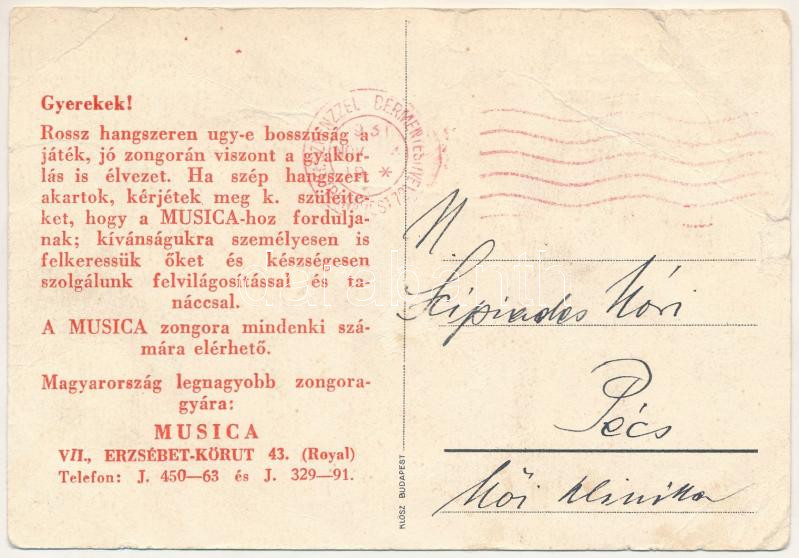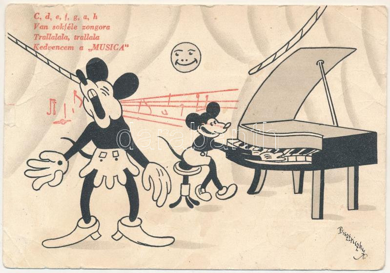 Mickey egér játszik a zongorán. Klösz korai Disney képeslap. Hátoldalon Musica reklám / Mickey Mouse playing on the piano. Early Hungarian Disney postcard s: Bisztriczky (szakadások / tears)