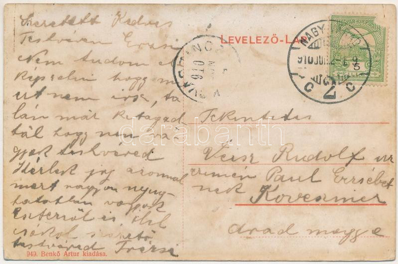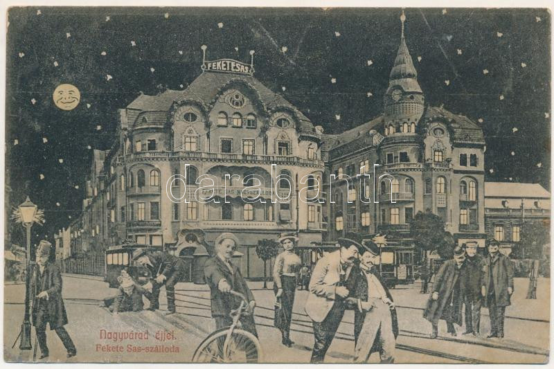 1910 Nagyvárad, Oradea; Fekete Sas nagy szálloda éjjel, villamosok. Humoros montázs részeg férfiakkal. Benkő Artur kiadása / hotel at night, trams. Humorous montage with drunk men (fl)