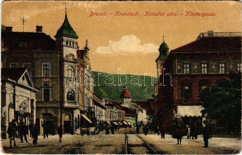 Leírás: Brassó, Kronstadt, Brasov; Kolostor utca. Grünfeld Vilmos kiadása / Klostergasse / street view (kopott sarkak / worn corners)
