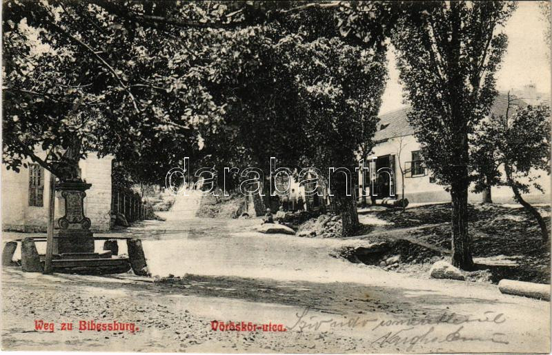 Leírás: 1917 Vöröskő, Cerveny Kamen (Cseszte, Castá); Vöröskör utca, üzlet / Weg zu Bibersburg / street, shop (fl)