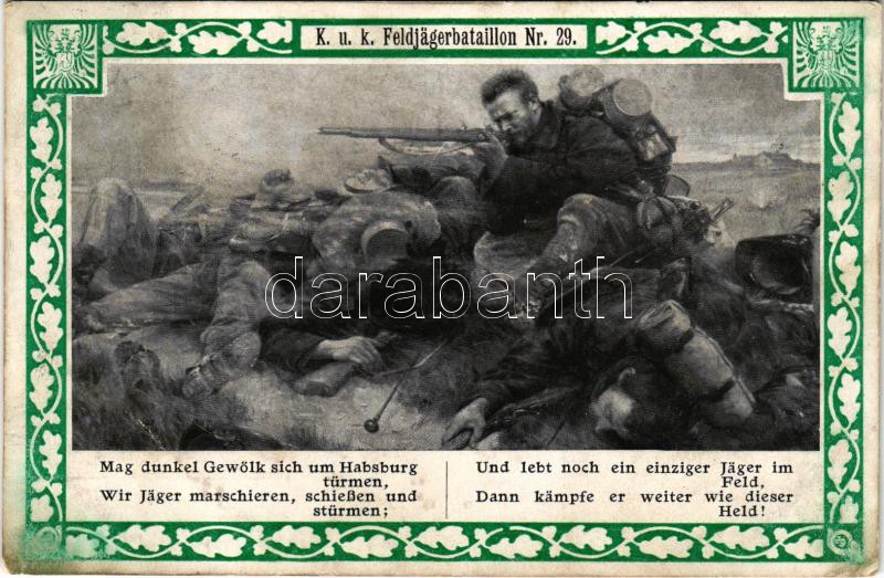 K.u.K. Feldjägerbataillon Nr. 29. / WWI K.u.K. military art postcard (... https://www.darabanth.com/hu/481-Gyorsarveres/481.0/Kepeslapok/Katonai~1000074/KuK-Feldjagerbataillon-Nr-29-WWI-KuK-military-art-postcard-gyurodes-crease~II3287425