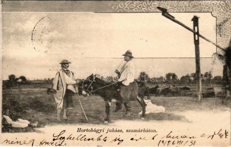 1906 Hortobágy, juhász szamárháton, magyar folklór. Pongrácz Géza kiad... https://www.darabanth.com/hu/481-Gyorsarveres/481.0/Kepeslapok/Magyarorszag~1000009/1906-Hortobagy-juhasz-szamarhaton-magyar-folklor-Pongracz-Geza-kiadasa-Kiss-Ferenc-eredeti~II3284884