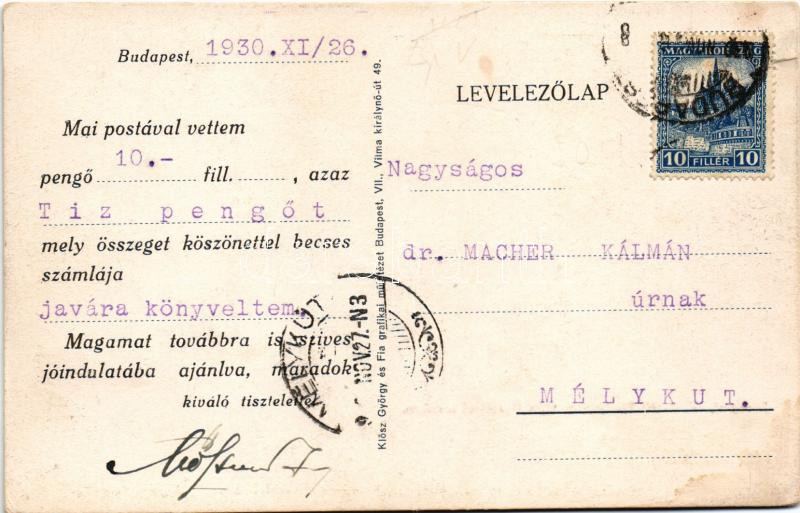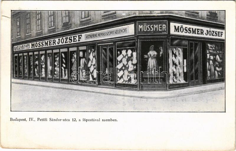 1930 Budapest V. Mössmer József asztalnemű menyasszonyi kelengye üzlete hátoldalon az üzlet reklámjával, Koronaherceg utca 12. főpostával szemben (szakadás / tear)