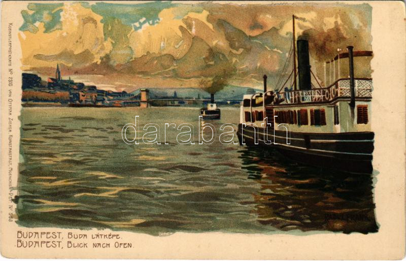 Leírás: Budapest, Buda látképe, gőzhajó. Kuenstlerpostkarte No. 2310. von Ottmar Zieher Kunstanstalt litho s: Raoul Frank