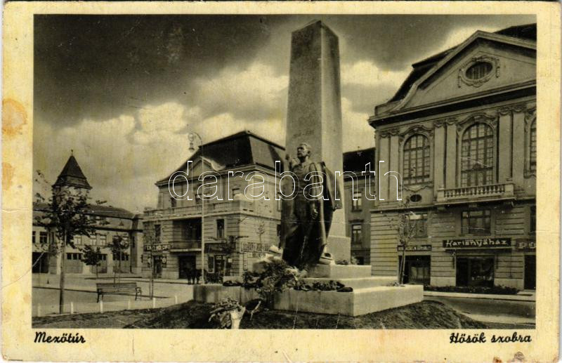 Leírás: Mezőtúr, Hősök szobra, emlékmű, harisnyaház, üzletek (fa)