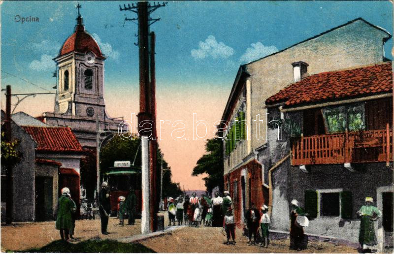 Leírás: 1917 Opicina, Opcina (Trieste); Chiesa di San Bartolomeo Apostolo / church, tram