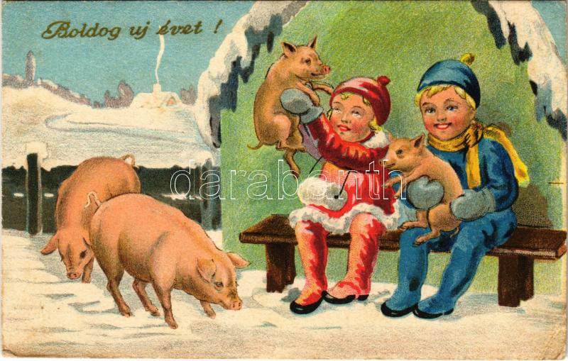 1938 Boldog Újévet / New Year greeting art postcard, children with pig... https://www.darabanth.com/hu/481-Gyorsarveres/481.0/Kepeslapok/Udvozlolapok-Unnepek~1000113/1938-Boldog-Ujevet-New-Year-greeting-art-postcard-children-with-pigs-EK~II3150634