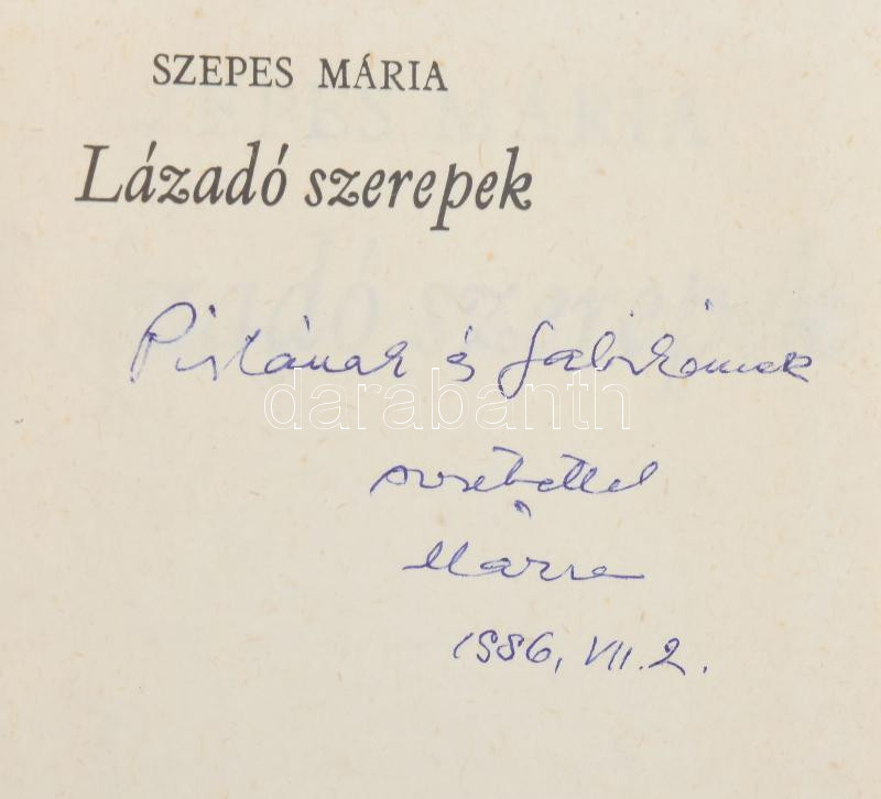 Szepes Mária: Lázadó szerepek. A szerző, Orsi Szepes Mária (1908-2007) által DEDIKÁLT példány. Bp., 1985, Szépirodalmi, 193+3 p. A borító Würtz Ádám munkája. Kiadói kartonált papírkötés.