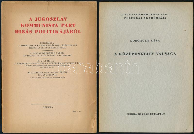 Losonczy Géza: A középosztály válsága. Bp.,1947,MKP Politikai Akadémia, (Szikra-ny.) Kiadói papírkötés. + A Jugoszláv Kommunista Párt hibás politikájáról. Bp., 1948, Szikra. Kiadói papírkötés.