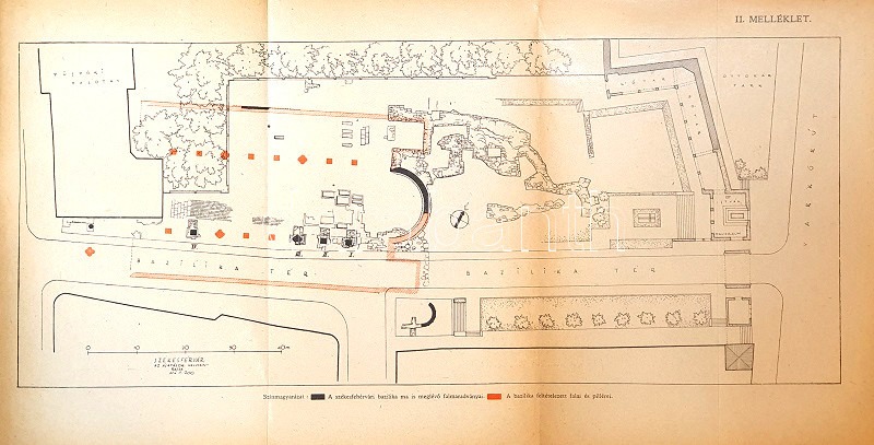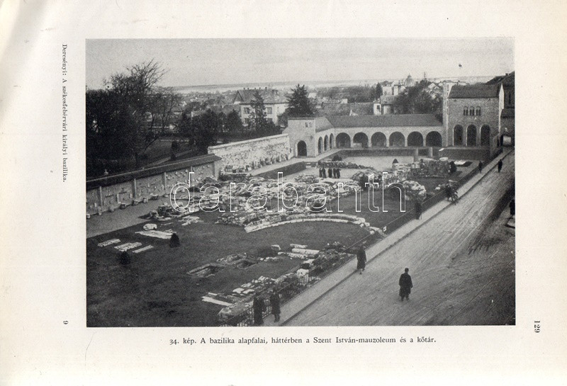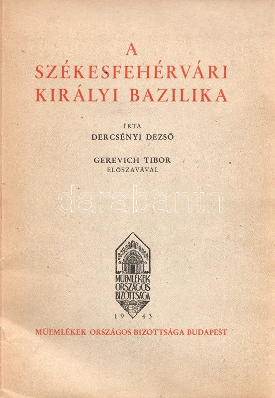 Dercsényi Dezső: A székesfehérvári királyi bazilika. Gerevich Tibor előszavával. Budapest, 1943. Műemlékek Országos Bizottsága (Királyi Magyar Egyetemi Nyomda). XII + 166 + [2] p. + 3 t. (kihajtható táblákon ásatási alaprajz). Egyetlen kiadás. A középkori Magyarország kiemelkedő jelentőségű bazilikája volt a Szent István által építtetett fehérvári Nagyboldogasszony-bazilika, fél évezreden keresztül a templom adott helyet a királykoronázásoknak, illetve Árpád-házi királyaink többsége ide temetkezett. A templom a török hódítás ideje alatt elpusztult, romjai a XIX. század elejére eltűntek, ám 1848 körül megindult a feltárás. A bazilika teljes feltárására kiemelt alkalmat szolgált a Szent István-emlékév, az arra való felkészülés keretében, 1936-1938 között zajlott az ásatás nagyja, a kőtár és a kiállítóhely is ekkor készült el. Szövegközti és egész oldalas ábrákkal, felvételekkel gazdagon illusztrált monográfiánk az ásatás története után részletesen elemzi és katalogizálja a feltárt anyagot, illetve méltatja annak jelentőségét. Példányunk fűzése az első borítónál enyhén meglazult. (Magyarország művészeti emlékei. II. sorozat, 1. kötet.) Fűzve, illusztrált, enyhén sérült kiadói borítóban. Jó példány.