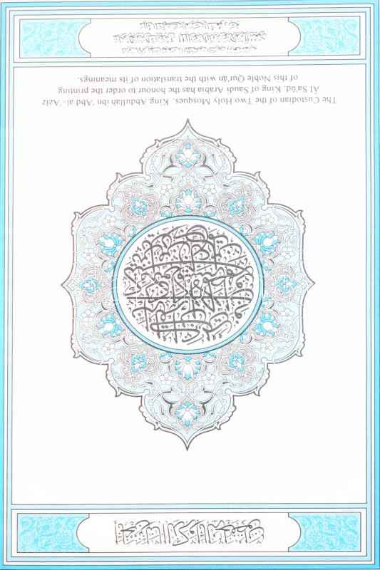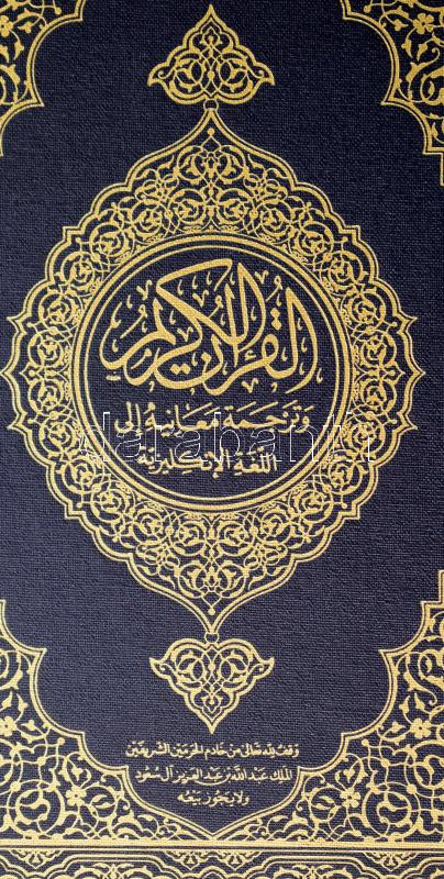 A Kegyes Korán. A Fahd Király nevét viselő, a Kegyes Korán nyomtatására alapított Komlexum. Kiadói aranyozott egészvászon-kötés. + Translation of the meanings of the Noble Qur'an in the English language by Dr. Muhammad Taqi-ud-Din al Hilali and Dr. Muhammad Muhsin Khan. Madinah, King Fahd Glorious Qur'an Printing Complex. Kiadói aranyozott egészvászon-kötés.
