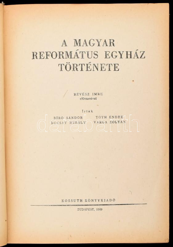 A magyar református egyház története. Révész Imre előszavával. Szerk.: Bíró Sándor, Szilágyi István. Bp., 1949, Kossuth. Matskássy Gyula illusztrációival. Fekete-fehér képekkel illusztrálva. Kiadói aranyozott félvászon-kötés, kopott borítóval.
