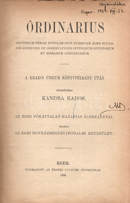 Ordinarius secundum veram notulam sive rubricam alme ecclesie Agriensis de observatione divinorum officiorum et horarum canonicarum. -- A krakói unicum könyvpéldány után közzéteszi Kandra Kabos.