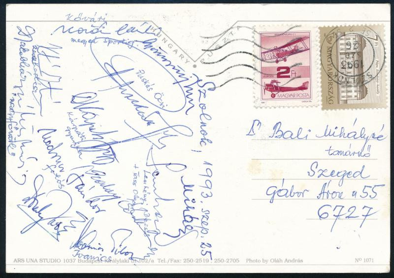 Leírás: 1993 Puskás Öcsi, Lemlényi Dezső, Kárpáti György olimpiai bajnokok és más sportolók, valamint Kővári László sportvezető által aláírt képeslap