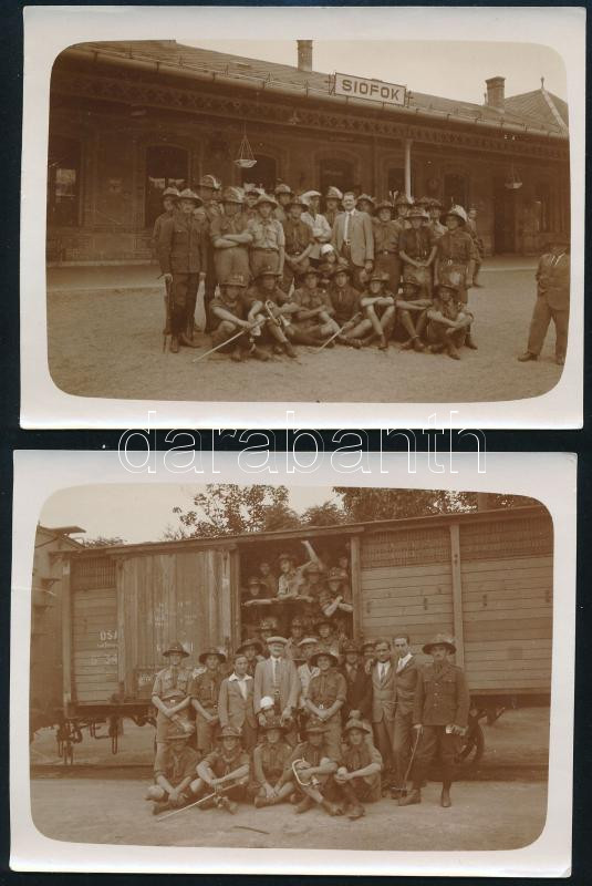 Leírás: 1928 Siófok, vasútállomás cserkészekkel, cserkésztábor, 2 db hátoldalon feliratozott fotó, 9×12 cm