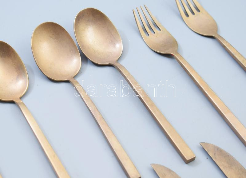 Leírás: Skantha Finland, Sigvard Bernadotte (1907-2002) designer: 4 személyes evőeszköz készlet. 16 darab, cca 1970, jelzett, bronz.