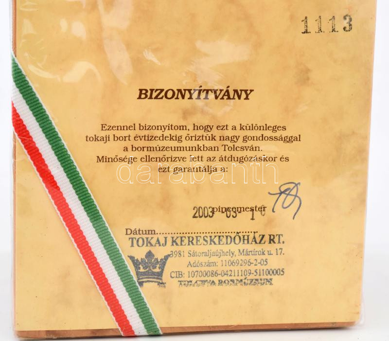 Leírás: 1983 Tokaji Szamorodni száraz, Tokaji Kereskedőház Rt. Sátoraljaújhely, 0,5 l sorszámozott, jelzett, bontatlan