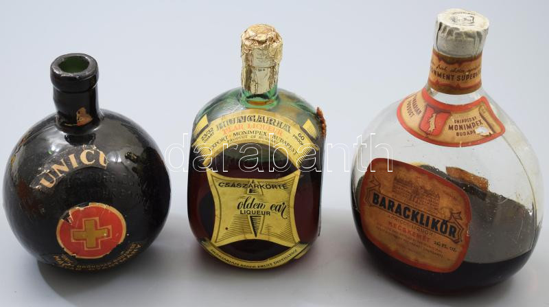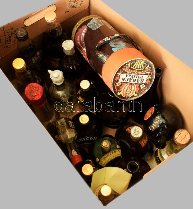 Leírás: 23 darab zömmel Zwack italos üveg, ital, bontott, párolgott, üres darabok pár bontatlan üveggel, közte ritka bontatlan Kecskeméti Baracklikőr, Cherry Brandy, Hungaria Pear Liqueur.