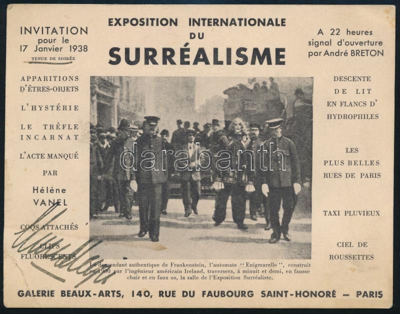 1938 Nemzetközi szürrealista kiállításra (Exposition international du surréalisme) szóló illusztrált meghívó, Párizs, Galerie beaux-arts, beazonosítandó aláírással, bal alsó sarkában törésnyommal