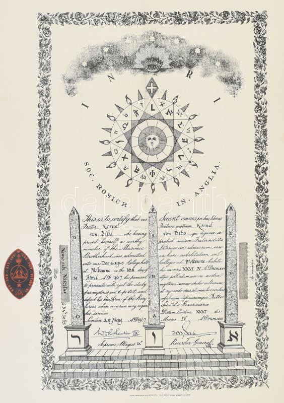 Leírás: 1967 Szabadkőműves okmány Angliából Bibó Kornél részére 36x54 cm