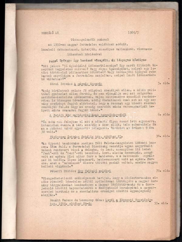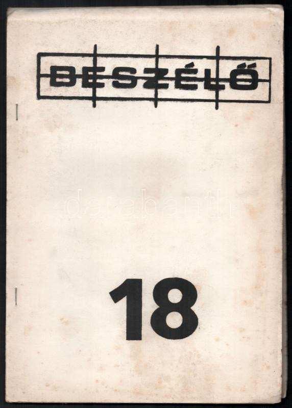 Leírás: 1986 Beszélő c. szamizdat kiadvány 18. száma (1986/3.), benne az 1956-os forradalomról megemlékező írásokkal, tűzött papírkötés, kissé foltos, 100 p.