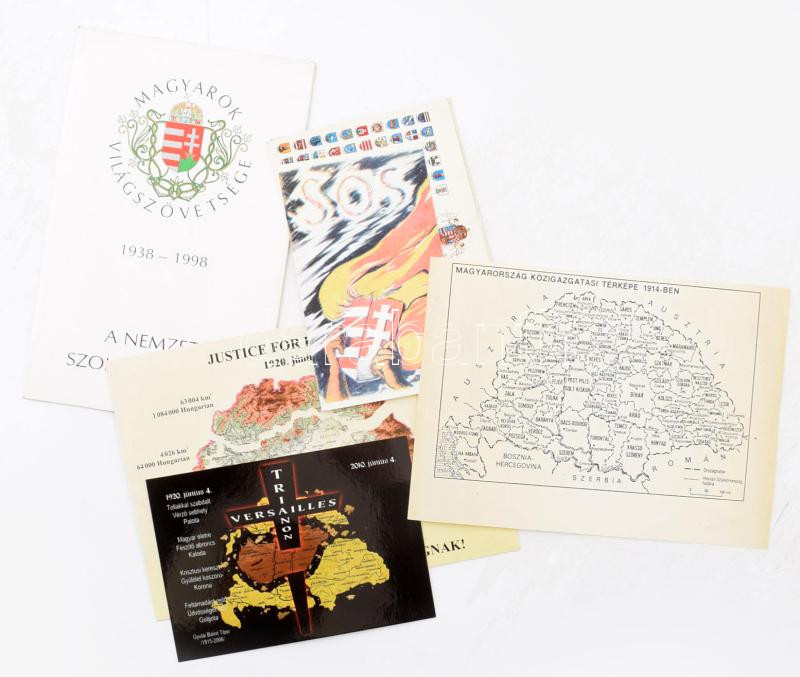 1998 Magyarok Világszövetsége, Világmagyarság Hajléka Nemzeti Történelmi Emlékpark, Ópusztaszer ismertető prospektus + Magyarország közigazgatási térképe 1914-ben, 21x15 cm + 5 db modern irredenta képeslap