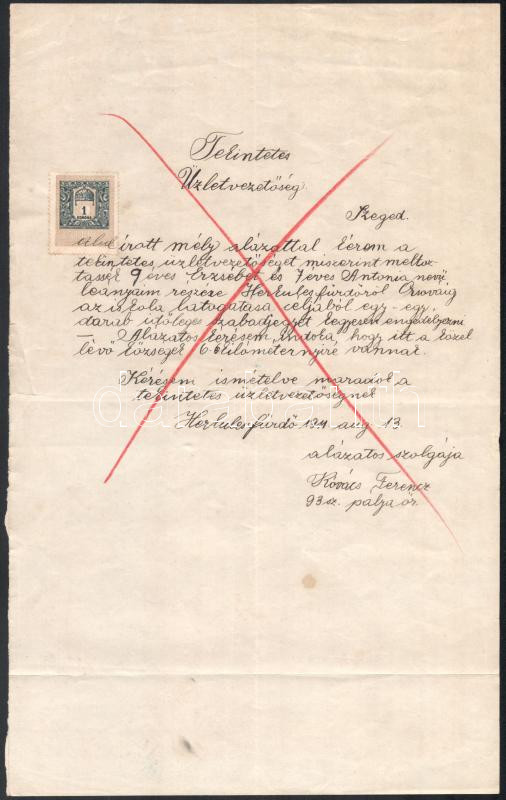 1911 Herkulesfürdő, Kovács Ferenc pályaőr a MÁV szegedi üzletvezetőségéhez benyújtott kérelme lányai számára szabadjegy biztosításáról, 1K okmánybélyeggel