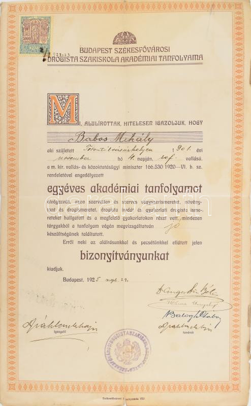 1925 Budapest Székesfővárosi Drogista Szakiskola akadémia tanfolyamának drogista (gyógyszerész) bizonyítványa, többek közt Augustin Béla (1877-1954) gyógyszerész, gyógynövénykutató, botanikus autográf aláírásával, fejléces papíron, 5000 és 4x1000 Korona okmánybélyegekkel, kisebb lapszéli szakadásokkal