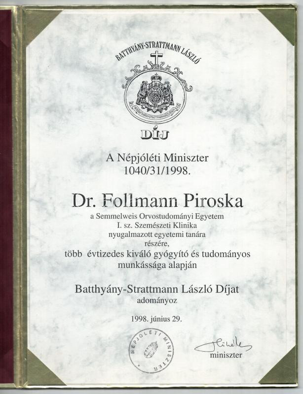 Leírás: 1998 Batthyány-Strattmann László díj adományozó oklevele, Kökény Mihály (1950- ) népjóléti miniszter aláírásával, bársonyborítású dísztokban