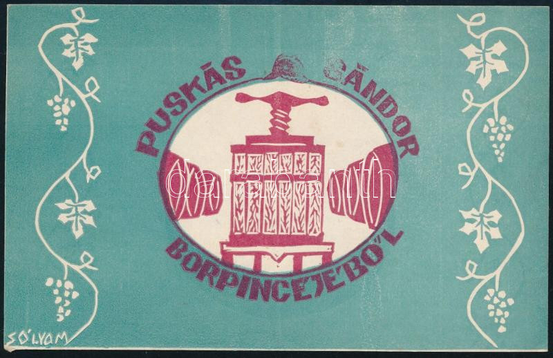 Leírás: ,,Puskás Sándor borpincéjéből" címke, szign.: Sólyom, 12x7,5 cm