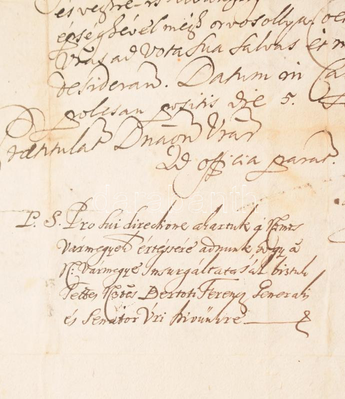 1708 II. Rákóczi Ferenc fejedelem levele egyik vármegyének, a kurucok számára katasztrofális vereséggel végződő Trencséni csata utáni második napon. Rákóczi a levelet Kistapolcsányban írta, ahová testőrei menekítették a harcokból. A levélben a fejeledelem kifejti, hogy az Isten azon nemzeteket akiket dicsőségre szám először megpróbálja és elviszi akár s kétségbeesésig, és hogy a "mostani trencséni harcnak szerencsétlenségével megakadályoztatta, és tovább való időre ... tartóztattya" ezt. A levélben arra buzdít, hogy csüggedésnek nincs helye, mert az az ellenségnek kedvez és felhívja a vármegyét, hogy a harcok után felbomlott seregeket "össze gyülekeztesse és táborunkba visszajönni kényszeríttesse" Szerencs mellé "elhívén, hogy a melly jó Istenünk ... és végre is kívánságunk és boldogulásunk tellyes épségével megorvosollya"