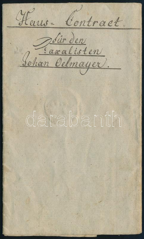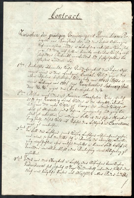 1827 Bonyhád, bérbeadási szerződés bonyhádi Perczel Ádám (1770-1833) földbirtokos, táblabíró, Tolna vármegye 1809-es inszurgens (nemesi felkelő) alezredese (bonyhádi Perczel Mór (1811-1899) honvédtábornok, az 1848-49-es szabadságharc egyik vezetőjének nagybátyja), valamint Johan Oelmayer között; két beírt oldal, német nyelven, Perczel Ádám aláírásával és címeres viaszpecséttel. Hajtva, megkímélt állapotban, 39x26 cm