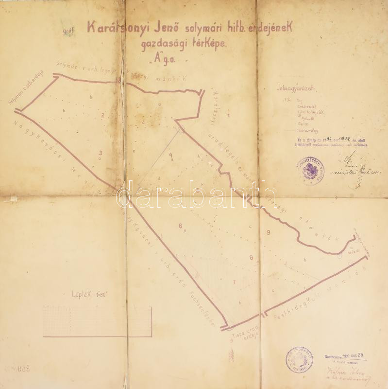 Leírás: 1934 Gróf Karátsonyi Jenő solymári hitb. erdejének gazdasági térképe, vászonra kasírozva, 50×48 cm