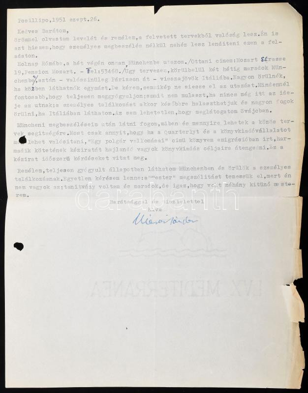 1951 Posillipo, Márai Sándor (1900-1989) író gépelt sorai, autográf aláírásával, Molnár József (1918-2009) emigráns magyar író, könyvkiadó, nyomdász, folyóirat szerkesztő, az Aurora Kiadó szerkesztője részére, reményteli Müncheni találkozás, valamint a "Egy polgár vallomásai" 3. kötetének ügyében. "Kedves Barátom" megszólítással, dátumozva (1951. szept. 26.), kis szakadásokkal.