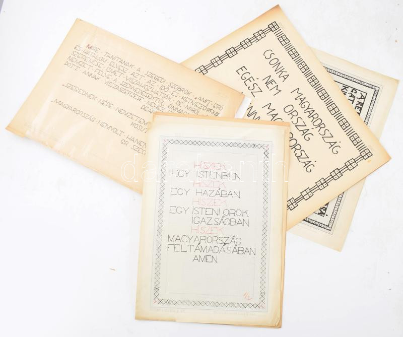 Leírás: cca 1930 Különféle, diákok által írt, irredenta témájú szövegek, oklevél tervek, Hiszekegy, stb 9 db 30x40 cm es lapokon