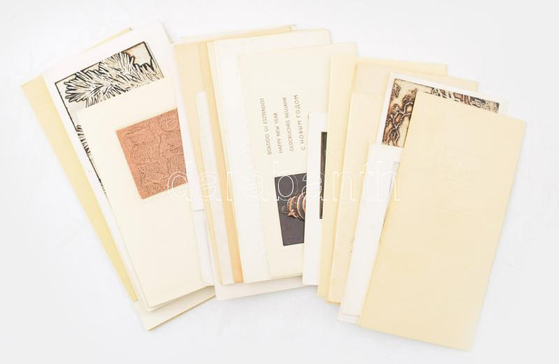 Leírás: cca 1960-1980 Fémlemezzel, bőrrel, dombornyomott mintával díszített üdvözlőlapok, össz. 22 db, közte több aláírt