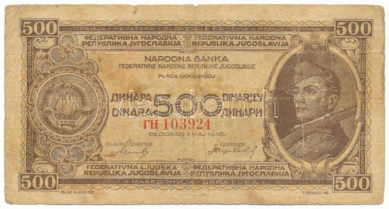 Leírás: Jugoszlávia 1946. 500D T:VG, szakadások