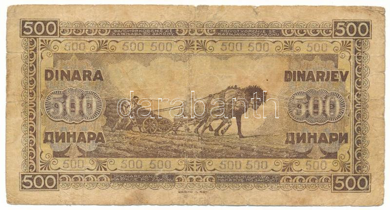 Yugoslavia 1946. 500 Dinara C... https://www.darabanth.com/hu/481-Gyorsarveres/481.0/Numizmatika/Kulfoldi-bankjegyek~500016/Jugoszlavia-1946-500D-T-VG-szakadasokYugoslavia-1946-500-Dinara-C-VG-tearsKrause-P2366~II3286120