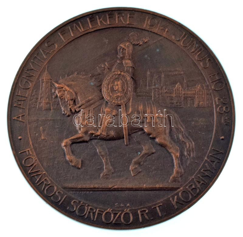 Ernst Kálmán(?) 1914. "Mátyás király az igazságos - Véd-jegy / Fővárosi Sörfőző R.T. Kőbányán - A megnyitás emlékére 1914. június hó 28-án" bronz emlékérem, "Exner K." és "S.G.A." gyártói jelzésekkel (51mm) T:AU,XF ph.