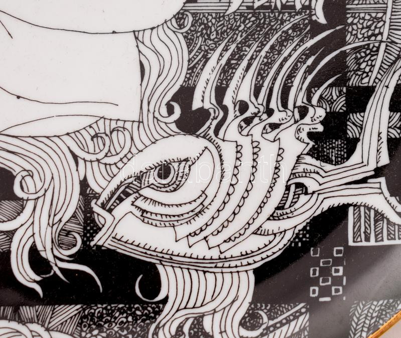Leírás: Hollóházi Szász Endre által tervezett mintával díszített porcelán dísztál. Matricás, jelzett, hibátlan d_: 26 cm Eredeti, sérült dobozzal