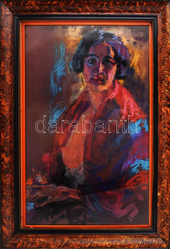 Leírás: Bardócz Árpád (1882-1938): Lengén öltözött hölgy portréja, 1929. Pasztell, karton. Jelezve jobbra lent. Hátoldalán régi MNG kiviteli bélyegzővel. Dekoratív, üvegezett, kissé kopott fakeretben, 60×49 cm