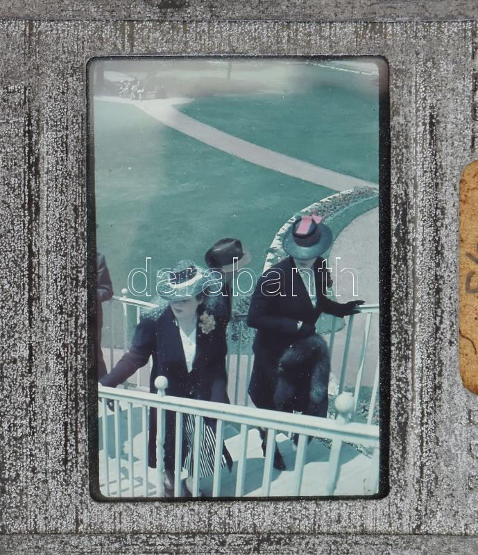 Leírás: cca 1940 Elegáns, kalapos hölgyek, Agfacolor diapozitív, fém keretben, 5x5 cm