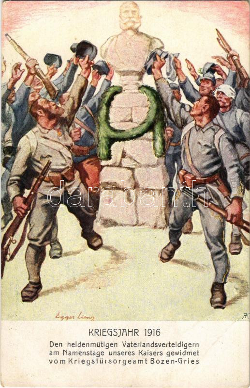 Kriegsjahr 1916. Den heldenmütigen Vaterlandsverteidigern am Namenstage unseres Kaisers gewidmet vom Kriegsfürsorgeamt Bozen-Gries. Offizielle Karte für Rotes Kreuz, Kriegsfürsorgeamt, Kriegshilfsbüro Nr. 568. / WWI Austro-Hungarian K.u.K. military art postcard, Franz Joseph I of Austria s: Egger-Lienz (EB)
